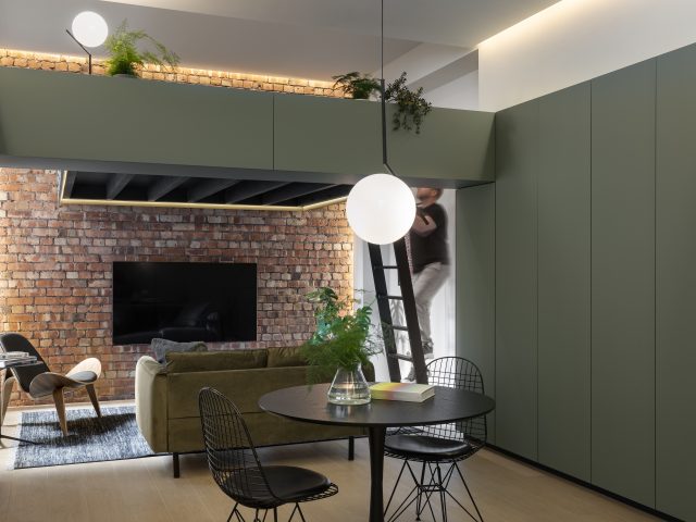 We also uncovered an original brick wall, previously plastered over, which became the main accent of the space.
